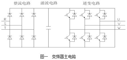 一、變頻器的原理 變頻器是一種將電壓頻率固定的交流電轉換為電壓和頻率可變的交流電的裝置,主電路一般為交—直—交,三相橋式整流回路將380V/50Hz的工頻交流電源整流成直流電壓,通過電容濾波和大功率開關元件(IGBT,GTO等)逆變為頻率可變的交流電壓,原理如圖1。