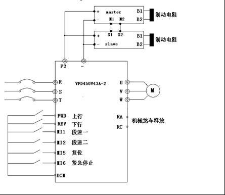 常見的卷揚(yáng)機(jī)噸位的范圍為:0.3T-30T卷揚(yáng)機(jī),型號則有約十多種,一些主要的型號中Jk表示快速卷揚(yáng)機(jī),Jm表示慢速卷揚(yáng)機(jī),Jt表示防爆卷揚(yáng)機(jī),單卷筒表示一個(gè)卷筒容納鋼絲繩,雙卷筒表示兩個(gè)卷筒容納鋼絲繩。該產(chǎn)品通用性高、結(jié)構(gòu)緊湊、體積小、重量輕、起重大、使用轉(zhuǎn)移方便,被廣泛應(yīng)用于建筑、水利工程、林業(yè)、礦山、碼頭等的物料升降或平拖,還可作現(xiàn)代化電控自動(dòng)作業(yè)線的配套設(shè)備。 二、設(shè)備介紹: 本系統(tǒng)主要應(yīng)用臺達(dá)VE系列變頻器并合理配置博邦電氣BBU制動(dòng)單元和BPRB制動(dòng)電阻,對電動(dòng)卷揚(yáng)機(jī)實(shí)現(xiàn)完美控制,把負(fù)載為10-12噸的貨物進(jìn)行升降、停止和平拖等動(dòng)作。設(shè)備示意圖如下: