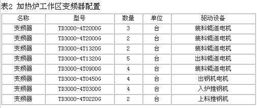 4.2多電機同步驅動系統配置 輥道是把鋼坯運送到加熱爐中進行加熱在把鋼坯運出的聯動運送設備,選用艾默生CT TD3000系列變頻器驅動多臺電機同時同步工作,制動電阻驗證矢量控制的精度,通過PROFIBUS-DP總線控制。加熱爐是對鋼坯進行預熱及達到均勻受熱。提高加熱處理的效果,提高產品質量。提高表面的加熱的退火(正火)后組織與確度均勻,加熱過程中使鋼的組織結構得到更好的完善,優化鋼坯的質量。加熱爐工作區輥道變頻器配置如表2所示。艾默生CT變頻器在鞍鋼新軋鋼冷軋1#、3#生產線工程軋機乳液裝置改造中應用EV2000-4T2800變頻器 6臺。 五、結束語 艾默生CT變頻器在鞍鋼集團公司的應用,充分的滿足了生產工藝和機械設備的要求,顯示變頻器優越的性能和極高的可靠性,得到用戶的好評與贊譽。豐富的規;咐龖皿w現了艾默生CT變頻器從制動單元到大功率模塊式驅動技術的成熟,展示出大型驅動技術供應商的大規模工業解決方案的品牌集成優勢。