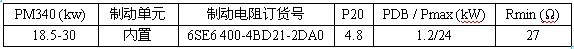 某項目有一15KW浮吊變幅機構用電機,額定電流35A,額定轉矩192N.m,選了22kw(重載18.5kw)的S120的功率模塊,看了樣本解釋該功率的PM340內置制動單元,可用制動電阻的最小阻值為27歐,參數如下表: