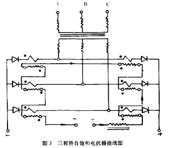 為了充分利用鐵芯磁化特性,增大調壓范圍.使~B-B 一(一B )一2Bb,則必須使H從+H 變到一H ,相應地使控制繞組電流從+T 變到一T .因此通常在自飽和電抗器上增設位移繞組.在其直流磁勢作用下,鐵芯予先達到飽和狀態,這樣可以在單方同調節控制繞組電流值時.能得到最大控制角。飽和電抗器三種繞組的安匝關系見圖2。當1 一0時,若位移繞組的安匝使鐵芯已在飽和點(此時B0=氏).在工作繞組開始導電時.其安匝極性與位移繞組安匝同方同,則芯完全飽和,于是控制角 0,調壓深度AUd=0。當控制電流從0向一2I 方向增大時,自飽和抗器初始磁密B0以+B 到一B 之間變動,1 1昕以當1 W 一-I w 時,鐵蕊磁通變化的量為告△=B ,調壓深賽為△ud=寺△u 而當控制繞組安匝為一2I w 時.則調壓深度為最大AUd=△U 。三相橋式電路自飽的電抗器和接線,如同 r代麗出一組控制繞組)。