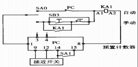 (智能型儀表控制系統原理圖) 在計數器面板上設定加工零件的總數;在計數器的信號輸入點(9、12、14)接入NPN型接近開關(SQ)。冷墩機每加工完成一個零件,接近開關發出一個信號給計數器,在顯示屏上顯示。計數器在顯示零件加工數量的同時,對預先設置的加工總數進行減1操作,當預置數減為0時,輔助輸出常閉觸點(3、4)斷開,使中間繼電器KA1失電,設備停止運行。為防止在自動加工過程中計數器設定的數據被他人更改,在計數器鍵保護輸入點(14、15)接一鑰匙開關(SA1),操作者設定完相關參數以后,旋動SA1可以將計數器操作面板上的所有鍵鎖定保護。 當加工工件達到預設數值時,設備自動停止工作,等待新的任務。當加工過程中中間需要停機續料或因故障停機時,零件加工數量保持年限最大可達10年,重新啟動時可以接著計數。計數器可以通過操作面板和背后按鈕進行復位,操作簡便,維護方便。