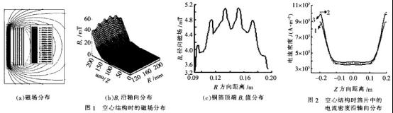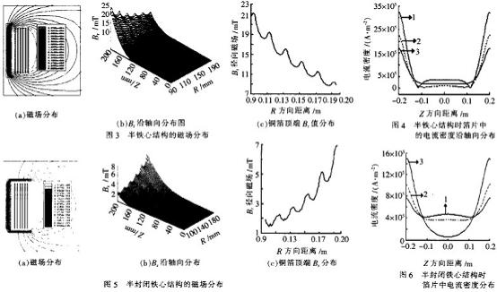 3、 半封閉鐵心電抗器仿真分析 半封閉鐵心結(jié)構(gòu)見(jiàn)圖5(a) 計(jì)算得磁場(chǎng)分布及徑向磁場(chǎng)B 分布見(jiàn)圖5(b),(C)。圖5(b)和(C)表明,磁力線主要集中在鐵心中,B 分量最大值在外層箔片端口處,但相對(duì)半鐵心情況減小了許多,B 的峰值只有0.007 T。箔片中電流分布見(jiàn)圖6.最外層箔片中電流密度分布最不均勻(曲線3),峰值達(dá)1 500 kA/m2。計(jì)算得交流損耗只=63.563 4 W.交直流損耗之比為: =P3/Po=63.563 4/32.444 7=1.959。即使采用全封閉鐵心結(jié)構(gòu)(計(jì)算圖省略),計(jì)算得交流損耗尸4=51.3543 W,交流與直流之比為:=4 F5 1.354 3/32.444 7=1.583。