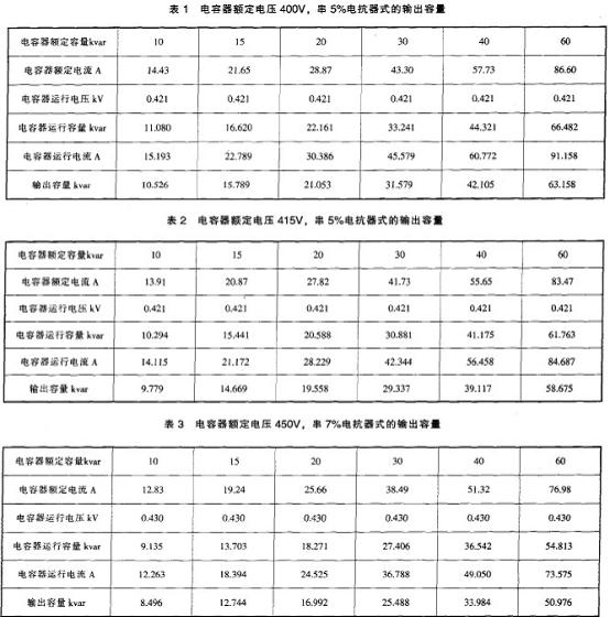 由于串電抗器后.電容器電抗器組的輸出容量和回路電流計算比較麻煩,為了使用方便,在此特把常用的電容器串聯電抗器后的參數變化做成表格,以便設計時查詢。這里選擇了四種情況進行了計算列表,見表1~表6。