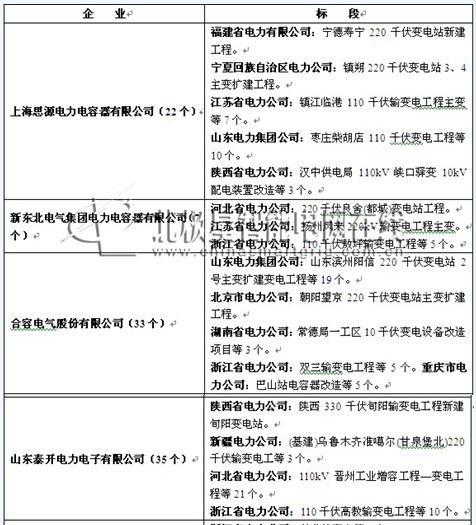 2013年電容器(內置電抗器)中標企業公示