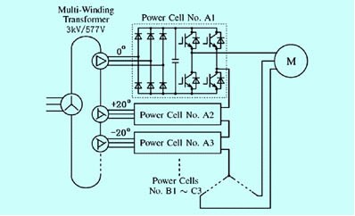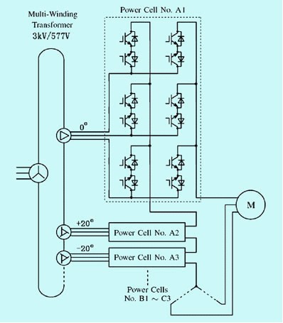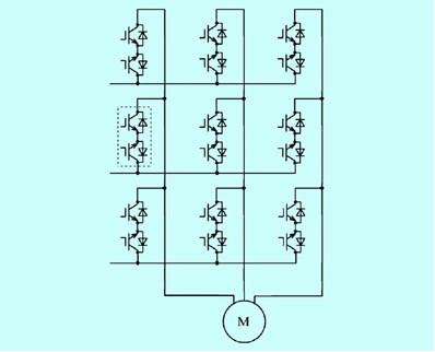 2.3 H橋級聯(lián)型高壓變頻器 H橋級聯(lián)型高壓變頻器,主要由移相式輸入變壓器和多個H橋單相逆變單元共同組成,單元與單元之間串聯(lián),并最終進行星形連接,從而實現(xiàn)三相輸出。如圖3所示,是一個3kV H橋級聯(lián)型高壓變頻器的電路拓撲形式,它的每一個相電壓由3個H橋單元串聯(lián)而成。