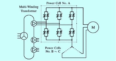 其實現(xiàn)方法是:三相高壓交流電經(jīng)移相變壓器的降壓、隔離和相移,形成互差一定角度的三相交流電。將該三相交流電分別送到各個矩陣變換單元,經(jīng)虛擬整流、換向、PWM斬波控制和三電平轉(zhuǎn)換,得到單相的交流電輸出。將數(shù)臺矩陣變換單元的輸出端串聯(lián)起來,并組合成星形,便得到了可直接驅(qū)動高壓電動機的三相交流電。每臺矩陣變換單元通過一對光纖接受控制器的指令和PWM信號,同時也能向控制器傳送狀態(tài)和告警信息。矩陣變換單元,采用虛擬整流技術(shù),沒有真正的直流環(huán)節(jié),不需要平波電容器,所以使用壽命得到延長,可以減少維護量,甚至可以設(shè)計出免維護的產(chǎn)品。