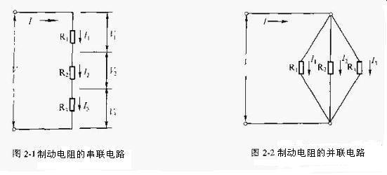 2. 在串聯(lián)電路中,制動電阻起到分壓和限壓的作用 實際情況如圖2-1所示,制動電阻有以下幾個特點: ①通過各電阻的電流是同一電流,即各電阻中的電流相等、I = I1 = I2 = I3; ②總電壓等于各電阻上的電壓降之和,,即V= V1 + V2 + V3; ③總電阻等于各電阻之和,即R=R1 + R2 +R3: 在實踐中可利用制動電阻串聯(lián)電路來進行分壓以改變輸出電壓,如收音機和擴音機的音量調節(jié)電路、半導體管工作點的偏置電路及降壓電路等。