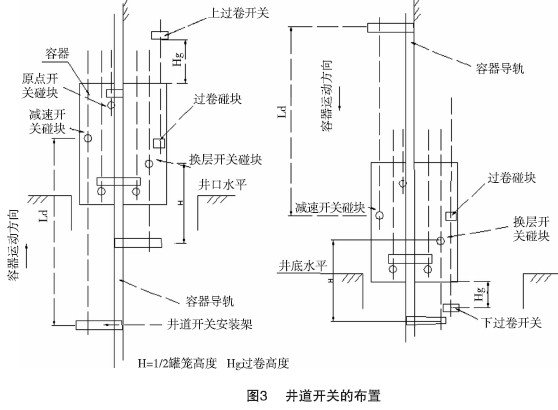 十、井道開關描述 豎井的停靠位置共為6個中斷,在井口和井底定位開關成對配置,一個為非接觸式,另一個為接觸式開關;井口和井底過卷開關成對配置,為帶狀鎖定的安全開關;主井井口和井底減速開關成對配置,在井口配置井口位置校對開關(又稱原點開關)。中間4個水平中段的上下兩側各配置1個減速開關,作為提升機的上行和下行減速。提升機的井道開關不與信號系統的井道開關共用,礦山提升系統多為半自動操作方式。井道開關的布置如圖3所示。