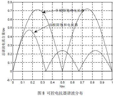 圖7為在該設計條件下的3 次諧波抑制效果圖,可見當中截面進入飽和工作區后,電抗 器輸出電流中3次諧波含量大大減小不到1%,這是因為小截面產生的3次諧波電流與中截面產生的3次諧波電流相位相反,互相抵消。圖8為單級飽和可控電抗器與兩級飽和可控電抗器總諧波含量的比較,可見雙級飽和可控電抗器的總諧波含量明顯低于單級飽和可控電抗器。