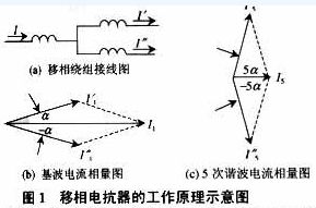 二、進線電抗器與串聯電抗器的理論分析 1、進線電抗器與串聯電抗器的工作原理 進線電抗器與串聯電抗器的作用是用來削弱或消除電力半導體變流裝置和非線性負載產生的諧波電流和電壓對供電系統的影響?紤]到三相對稱供電系統中一般以5、7、11和13次諧波含量較大且對系統影響較為嚴重,故進線電抗器與串聯電抗器可主要針對綜合削弱這幾次諧波來設計。其工作原理可由圖1所示電路接線圖及相量圖說明。
