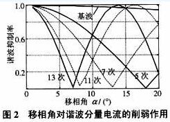 2、最佳移相角的確定 由上面分析可知,通過選取某個特定的移相角可消除某次諧波電流的影響,如取a =18度,則可消除5次諧波。想通過選定某個特定的移相角來同時消除多次諧波帶來的影響是不可能的。要想通過選定某個特定的移相角同時對幾次諧波都有較好的削弱作用,必須綜合考慮移相角對各次諧波的影響。不同移相角對基波和5、7、11和13等主要次諧波的衰減作用如圖2示?紤]到5次和7次諧波分量通常比11和13次諧波含量大且對供電系統的影響更為嚴重,可選取移相角a≈11度。