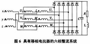 一、引 言 由于變流裝置中用作換流元件的電力半導體器件工作在開關狀態,變流器產生的電壓和電流多為非正弦波形,包含了大量的諧波。近年來,隨著電力電子裝置的廣泛應用,使得電力電子變流裝置成為電力系統最大的諧波源。電壓和電流諧波對用電和通信設備產生一系列不利影響,因而諧波抑制成為變流器供電系統亟待解決的問題。 在各種電力電子裝置中,整流裝置所占的比例最大,也是最大的諧波來源。大容量的變流器供電系統減少向電網注入諧波的主要方法是采用多相整流電路和變流器的多重化技術,一般需要采用多繞組移相變壓器進行電路移相。本文所介紹的是用進線電抗器與串聯電抗器取代移相變壓器的一種新型電路拓撲結構,由于進線電抗器與串聯電抗器是串聯在主電路中,需要的移相線圈匝數很少,與移相變壓器相比,體積和重量要小得多,從而可大大降低移相電路的成本。