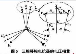 4、移相繞組電壓與匝數的確定 圖3所示的三相進線電抗器與串聯電抗器繞組電壓的相量關系如圖5所示。設電氣中性點為O,UX為A相輸入相電壓,而UV1和UV2分別輸出移相電壓。因三相進線電抗器與串聯電抗器的三組繞組呈對稱連接,故其它兩組線圈移相規律與A相相同并互差120度。顯然,對于不同的供電電源電壓及不同的移相角,移相繞組上的電壓UAX、UBY和UCY是不同的。設移相繞組上電壓的有效值為由式(4)可確定移相繞組的電壓和匝數。
