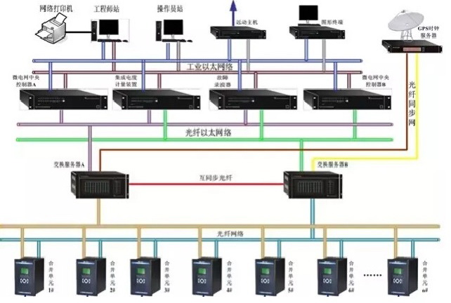 1、過(guò)程層 系統(tǒng)過(guò)程層設(shè)備即合并單元(合并單元和智能單元一體設(shè)備)按系統(tǒng)內(nèi)一次設(shè)備配置,就地加裝在主變、斷路器、分布式發(fā)電設(shè)備、儲(chǔ)能設(shè)備等處,采集現(xiàn)場(chǎng)數(shù)字通過(guò)點(diǎn)對(duì)點(diǎn)光纖光纖網(wǎng)上送交換服務(wù)器,單臺(tái)交換服務(wù)器滿足接入45臺(tái)合并單元的數(shù)據(jù)處理要求,交換服務(wù)器集成全站數(shù)據(jù)信息后通過(guò)工業(yè)以太網(wǎng),實(shí)現(xiàn)分布式采集數(shù)據(jù)到間隔層裝置---智能電抗器中央控制器的通訊傳輸,同時(shí)合并單元接收中央控制器控制命令實(shí)現(xiàn)對(duì)風(fēng)機(jī)、光伏、儲(chǔ)能等設(shè)備的監(jiān)測(cè)和控制。