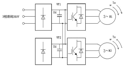 圖三 共用直流母線的回饋制動方式 圖三接線是典型的共用直流母線的制動方式,M1是處于電動狀態,M2經常處于發電狀態,三相交流電源380V接到處于電動狀態的電機M1上的變頻器VF1端,而VF2則通過共用直流母線方式與VF1的母線相連。在此種方式下,VF2僅做為逆變器在使用,M2處于電動時,所需能量由交流電網通過VF1的整流橋獲得;M2處于發電時,反饋能量通過直流母線由M2的電動狀態消耗。