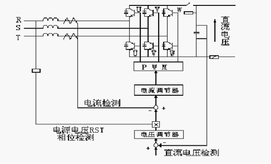 圖四 回饋電網制動原理圖 圖四所示為回饋電網制動原理圖,它采用了電流追蹤型PWM整流器,這樣就容易實現功率的雙向流動,且具有很快的動態響應速度。同時,這樣的拓撲結構使得我們能夠完全控制交流側和直流側之間的無功和有功的交換。