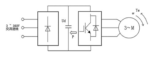 圖一 變頻器調速系統的二種運行狀態 圖一所示為變頻器調速系統的二種運行狀態,即電動和發電。在變頻調速系統中,電機的降速和停機是通過逐漸減小頻率來實現的,在頻率減小的瞬間,電機的同步轉速隨之下降,而由于機械慣性的原因,電機的轉子轉速未變。當同步轉速w1小于轉子轉速w時,轉子電流的相位幾乎改變了180度,電機從電動狀態變為發電狀態;與此同時,電機軸上的轉矩變成了制動轉矩Te,使電機的轉速迅速下降,電機處于再生制動狀態。電機再生的電能P經續流二極管全波整流后反饋到直流電路。由于直流電路的電能無法通過整流橋回饋到電網,僅靠變頻器本身的電容吸收,雖然其他部分能消耗電能,但電容仍有短時間的電荷堆積,形成“泵升電壓”,使直流電壓Ud升高。過高的直流電壓將使各部分器件受到損害。 因此,對于負載處于發電制動狀態中必須采取必需的措施處理這部分再生能量。本文闡述的就是處理再生能量的方法:能耗制動和回饋制動。